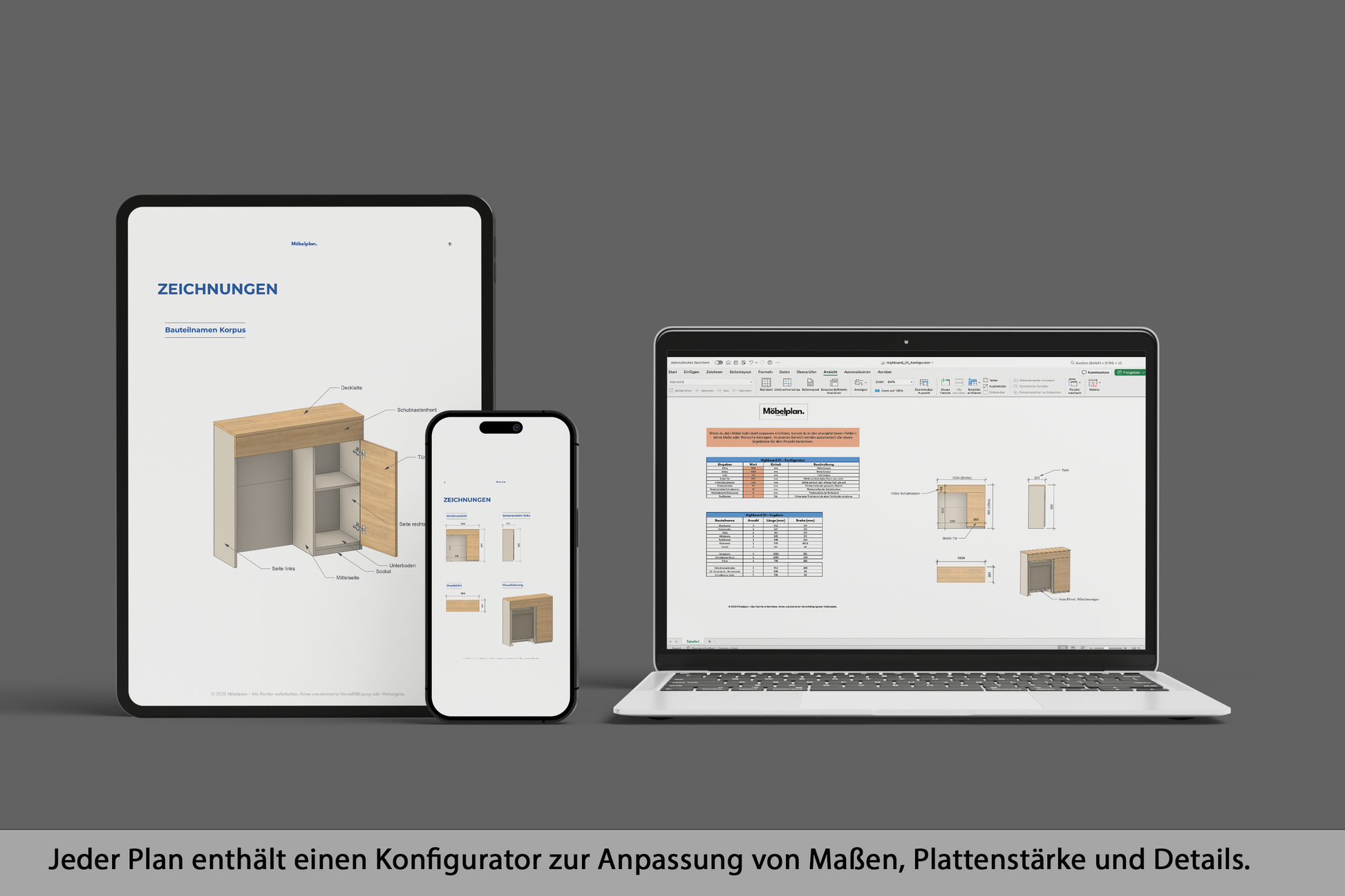 Das Möbel kannst du im Möbelplan-Konfigurator exakt auf deine Bedürfnisse anpassen. Die Maße der Bauteile werden automatisch neu berechnet.
