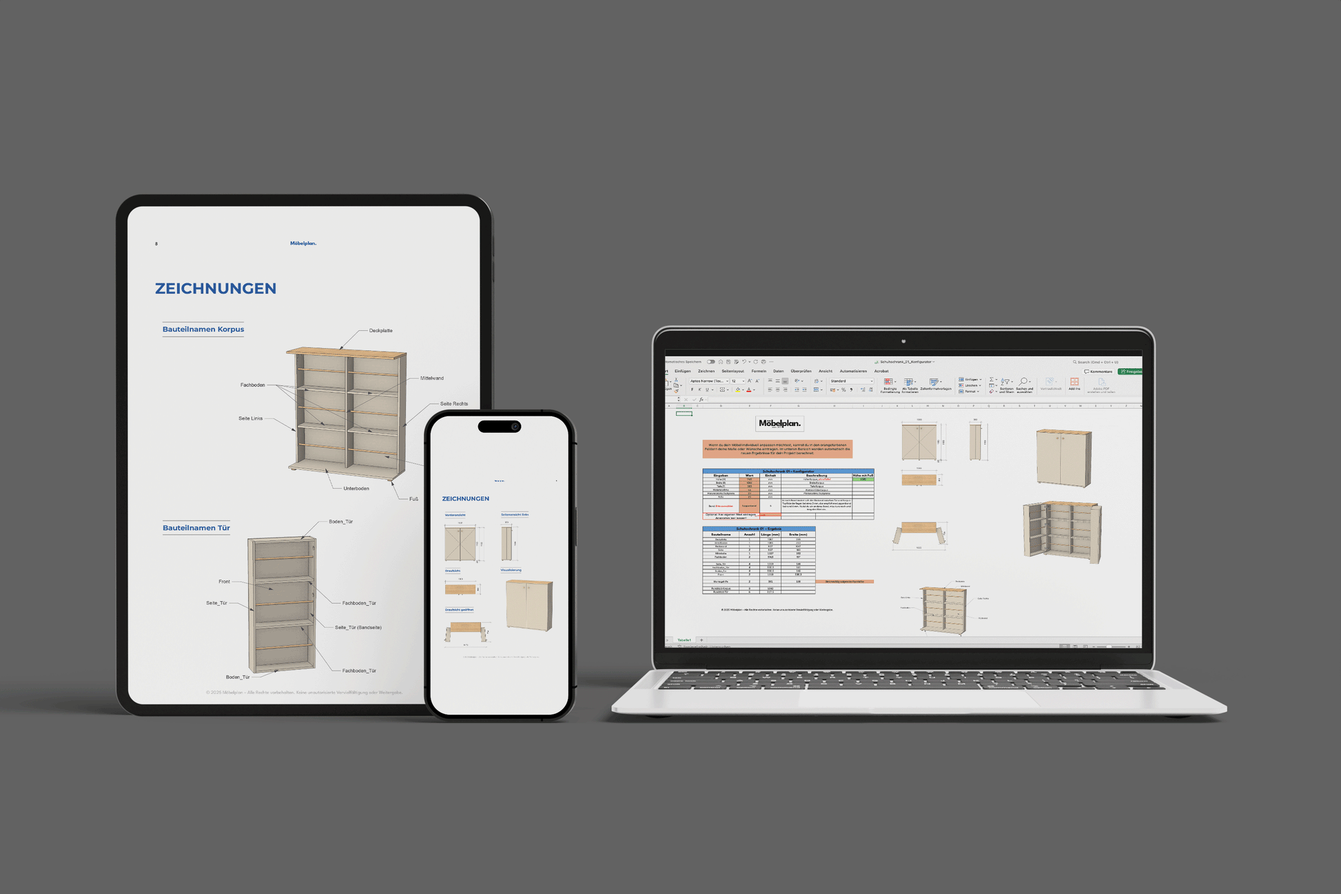 Das Möbel kannst du im Möbelplan-Konfigurator exakt auf deine Bedürfnisse anpassen. Die Maße der Bauteile werden automatisch neu berechnet.